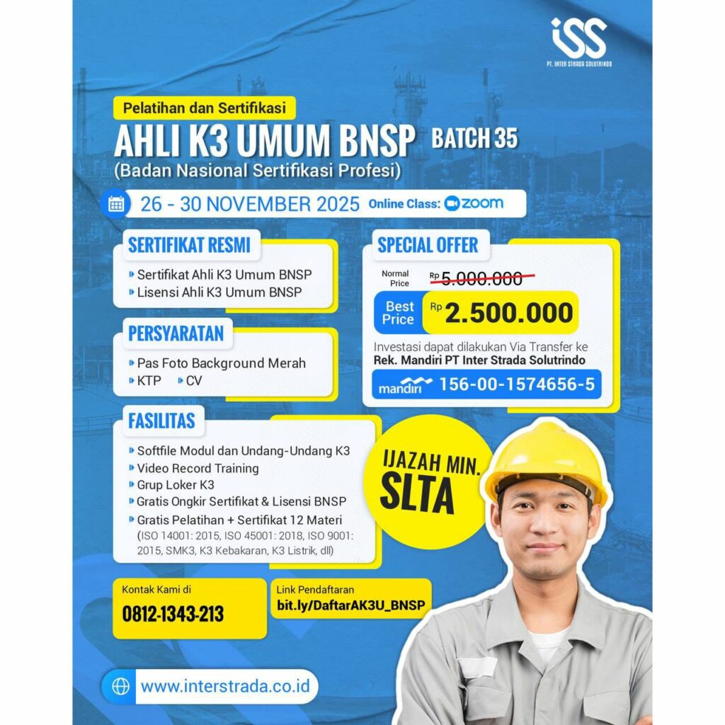 1. Sertifikasi Ahli K3 Umum BNSP [26 – 30 November 2025]