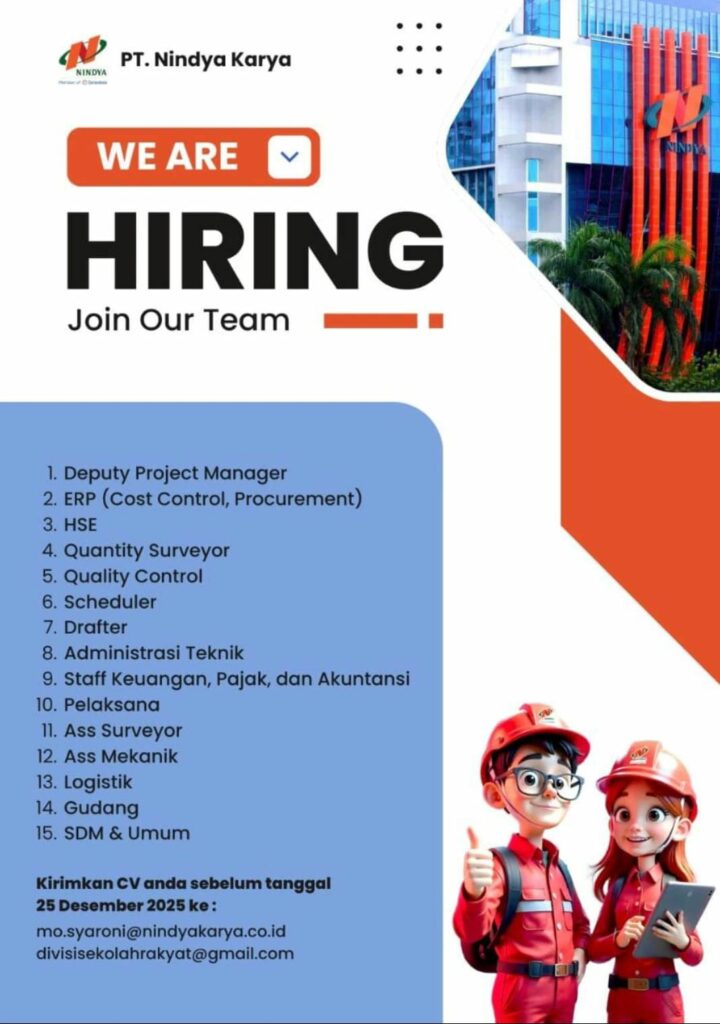PT Nindya Karya (Persero) membuka peluang karir yang luas bagi talenta muda dan profesional berpengalaman yang ingin berkembang di industri konstruksi dan infrastruktur. Kesempatan kerja tersedia untuk berbagai posisi seperti Engineer Sipil, Engineer Mekanikal & Elektrikal, Quantity Surveyor, Project Control, K3 (Keselamatan dan Kesehatan Kerja), Keuangan, SDM, hingga Manajemen Proyek. Simak informasi lengkap tentang posisi yang tersedia dan persyaratan rekrutmen di bawah ini.