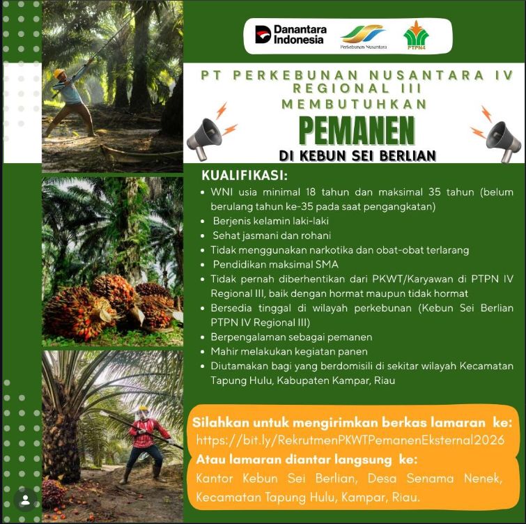 - Bersedia tinggal di wilayah perkebunan (Kebun Sei Berlian PTPN IV Regional III)
