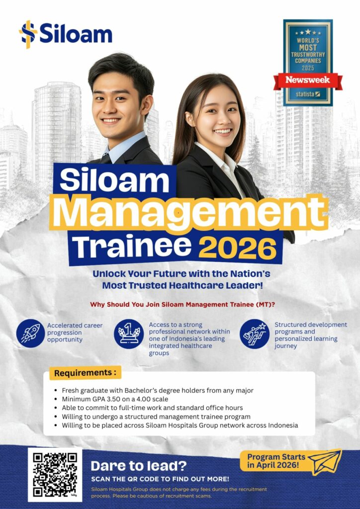 • Siloam Management Trainee (MT) Program 2026 is designed for high-potential fresh graduates who are eager to learn, lead, and grow within Indonesia’s most trusted healthcare network.